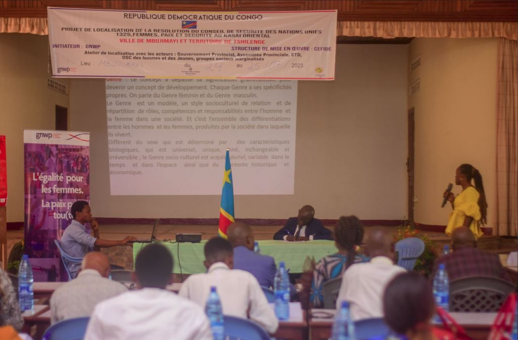 Organisé par le Centre féminin de formation et d’information pour le développement CEFIDE avec l’appui du Réseau Mondial des femmes artisanes pour la paix (GNWP) sous financement du Bureau des questions féminines mondiales du Departement d’Etat americain S/GWI en sigle, cet atelier de deux jours sur la Localisation de la 1325 auquel participent les chefs coutumiers , les gestionnaires des ETDs, les groupes sociaux marginalisés, les services de sécurité de la province, les députés provinciaux, les activistes des droits des femmes et jeunes, voudrait aborder selon le contexte de la ville de Mbuji-Mayi et le territoire de Tshilengi, les questions liées à l’agenda Femmes, Paix et Sécurité. Les travaux ont été lancés ce 24 juillet par la Ministre provinciale du Genre dans la salle Mpokolo wa moyo en présence de la délégation de GNWP venue pour la circonstance avec en tête la Directrice Programme Katrina LECLERC.